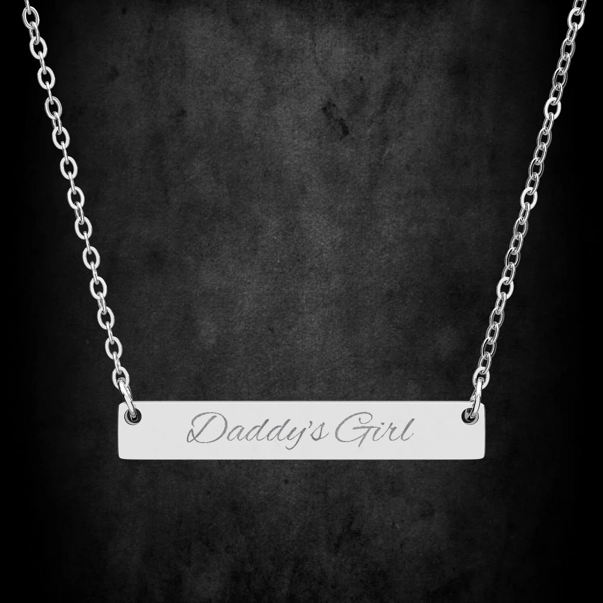 A slim, engraved bar necklace that reads like a private note worn close to the heart. The surgical-grade stainless steel bar is finely laser-etched with a crisp script and hangs on a delicate chain so the message sits flat against the collarbone. It catches light with a low-key shine—subtle, personal, and built to last. Lightweight and hypoallergenic, this piece moves from quiet everyday wear to sentimental layering for nights when you want something meaningful but understated. The engraving is permanent, and the PVD-coated option adds extra depth for a darker, more modern look.